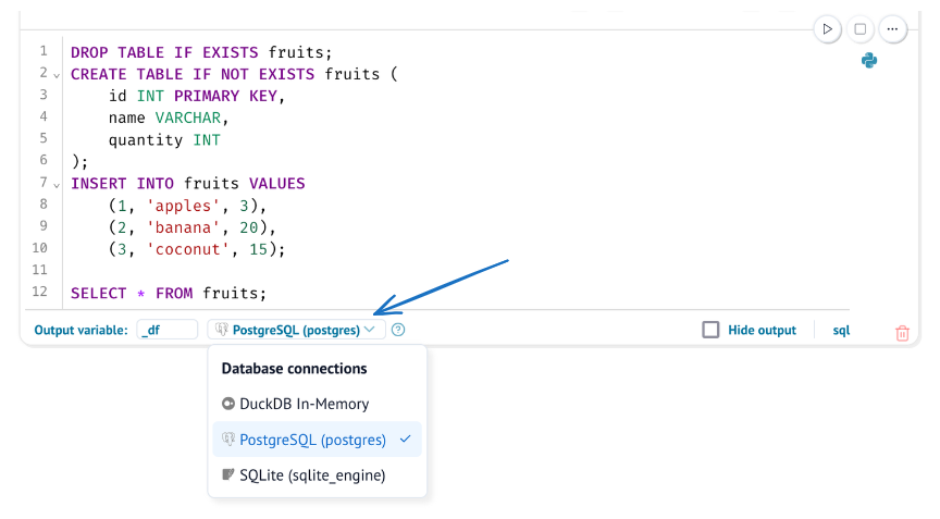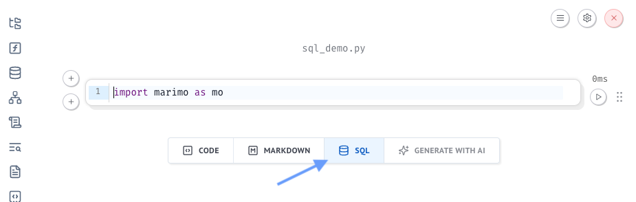 First, you need to define the engine as a Python variable in a cell. marimo will auto-discover the engine and let you select it in a dropdown in the SQL cell.
